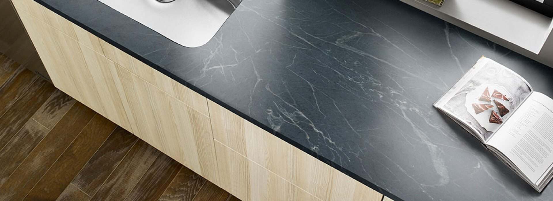 Soapstone is a softer, natural stone with an unrefined charm that has gray and black tones and can have hints of greens and blue undertones. It’s a very popular option for kitchens due to its natural beauty. It can be left as is or treated with mineral oil which can enhance the movement and deepen the color to a darker, richer tone. Soapstone countertops are very soft and will scratch very easily. If a patina look is desired you’ll love this material. If not, just sand out scratches and treat with mineral oil and you’ll be back in business!